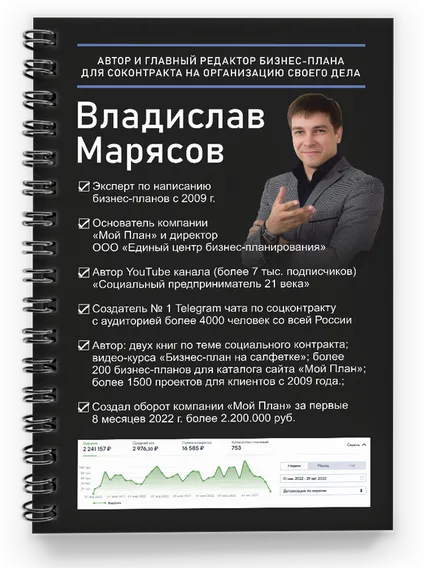 ✔ Авторские права: Владислав Марясов — После 13 лет практики в бизнес-планировании и 15 лет в бизнесе в более чем 10 нишах, в 2021 году с господдержкой от ЦЗН основал компанию "Мой План". За 2022 год у компании более 900 Клиентов из 160 городов РФ.