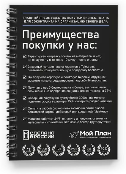 Какие гарантии, что я получу соцконтракт, если куплю ваш бизнес-план? Будем с Вами откровенны, гарантии, что Вы получите соцконтракт мы дать не можем. Потому что одобрение зависит не только от бизнес-плана, но и от других факторов: уровень дохода, количество движимого и недвижимого имущества, вовремя и достоверно предоставленной информации о себе. Однако, более 75% клиентов получают одобрение по соцконтракту, благодаря нашим бизнес-планам.